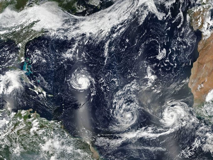 Imagen facilitada por la NASA que muestra los huracanes (i-d) Florence, Isaac y Helene avanzando por aguas del Atlántico Norte, el pasado 10 de septiembre de 2018. EFE/Nasa