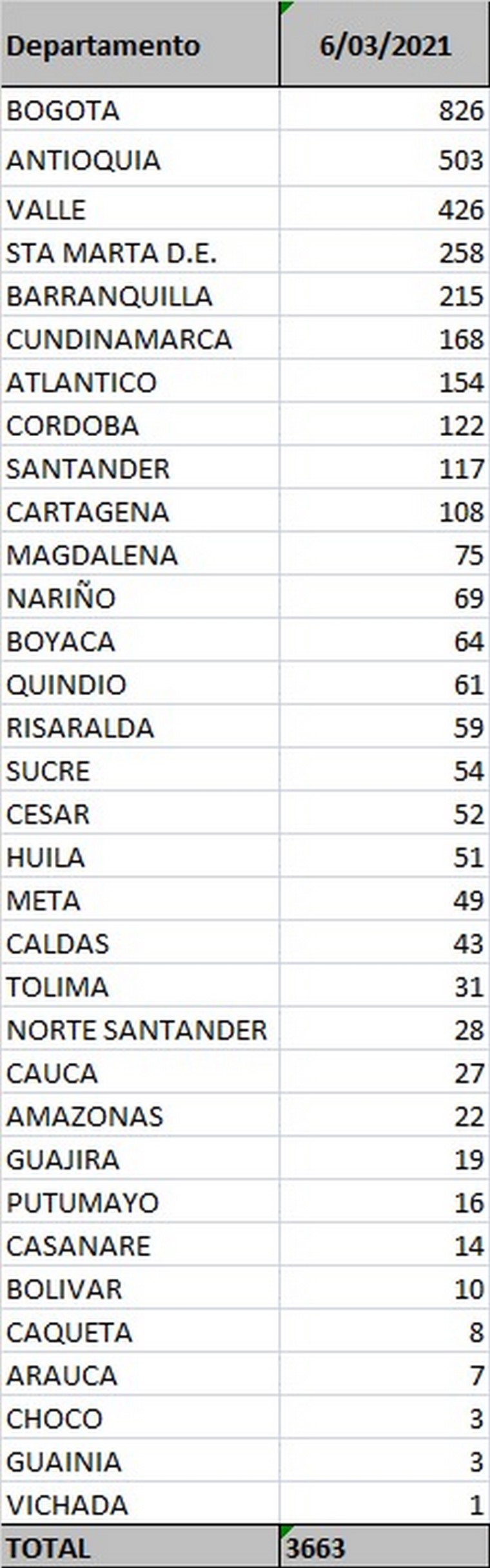33.203 casos activoshttps://t.co/SiKTpTCQ3W pic.twitter.com/vun4GNuVD3— MinSaludCol (@MinSaludCol) March 6, 2021