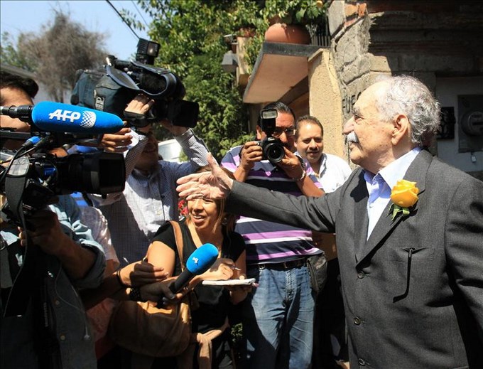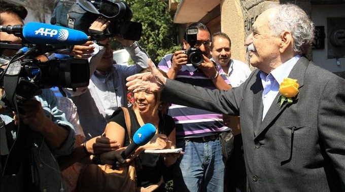 El nobel de literatura salió pasado el mediodía a la puerta de su residencia, ubicada en el sur de Ciudad de México, a saludar a más de una decena de periodistas y fotógrafos que desde temprano hacían guardia para ver al autor de “Cien años de soledad”.