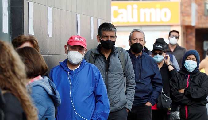 Varias personas hacen fila para entrar a un centro comercial de la localidad de Suba en Bogotá (Colombia). EFE/Carlos Ortega