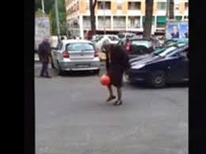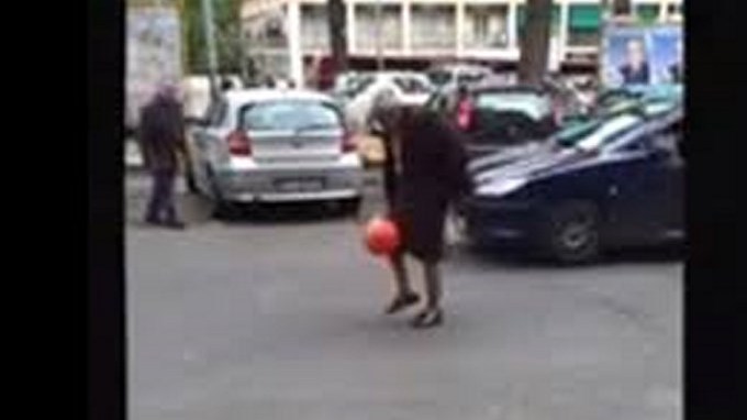 En el video se ve una anciana que con su vestido, zapatos y bolso, se pone a jugar en una calle con un balón de fútbol.