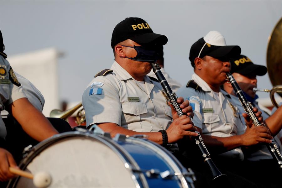 Una banda musical de la Policía Nacional Civil guatemalteca anima las calles de algunas ciudades de Guatemala durante el toque de queda decretado por el Gobierno para frenar la curva de contagio de la pandemia del SARS-CoV-2, el nombre oficial del llamado coronavirus.