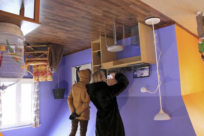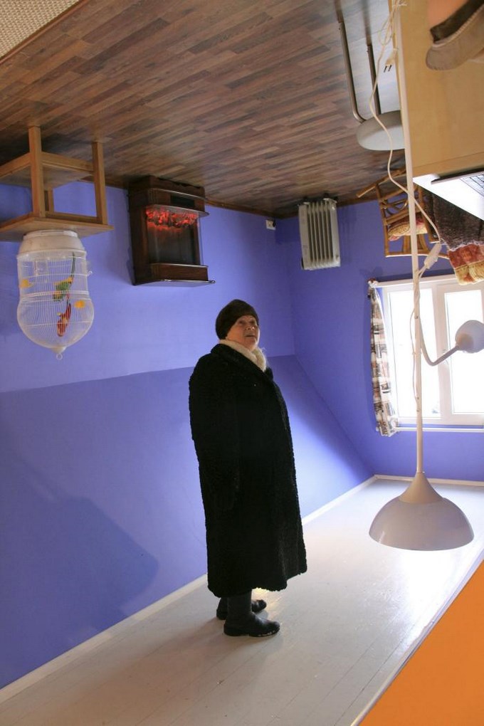 Nada más entrar por la puerta uno tiene sensación de vértigo, no tanto por el hecho de que los muebles estén pegados al techo, sino por una ligera inclinación del suelo, hecha especialmente para agudizar la ilusión.