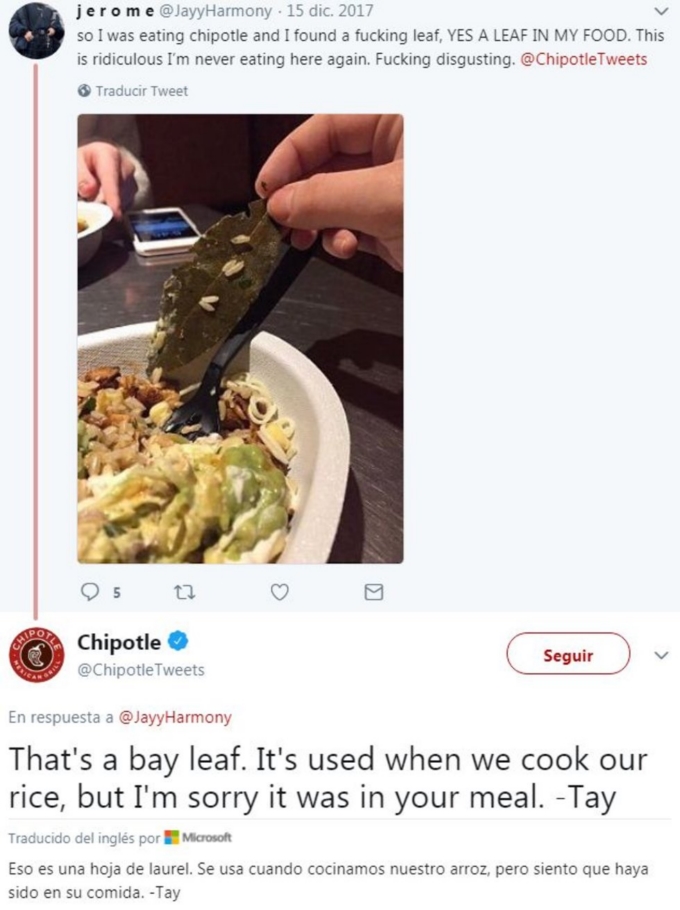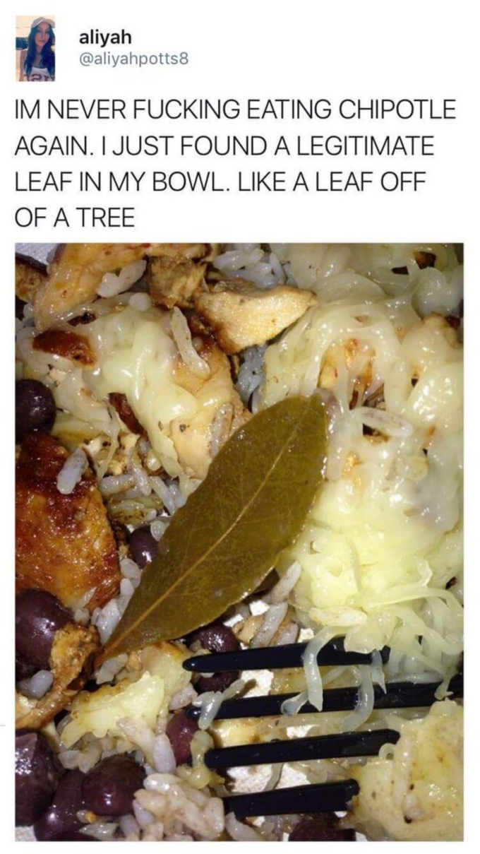 “Jamás en la vida volveré a comer en Chipotle. Acabo de encontrar una hoja en mi plato. Como una hoja caída de un árbol”