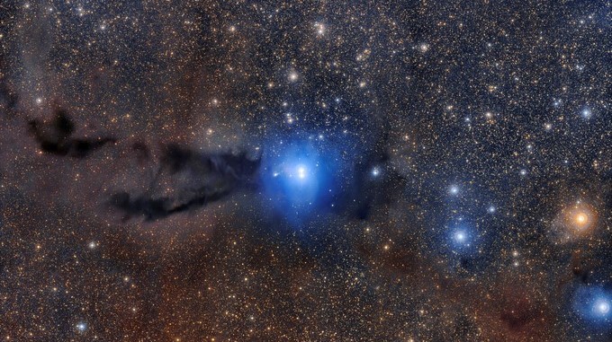 La composición más detallada realizada hasta el momento de la región de formación estelar Lupus 3 muestra una nube oscura de polvo cósmico con apariencia de serpiente deforme, iluminada por la brillante luz de las dos nuevas estrellas azules que centran esta espectacular imagen de amplio campo.