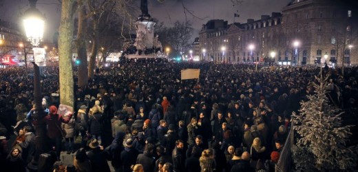 Miles de personas protestan hoy en la emblemática plaza parisina de la Republique en un silencio absoluto contra la masacre terrorista perpetrada en la sede del semanario ‘Charlie Hebdo’, en la que murieron al menos doce personas.