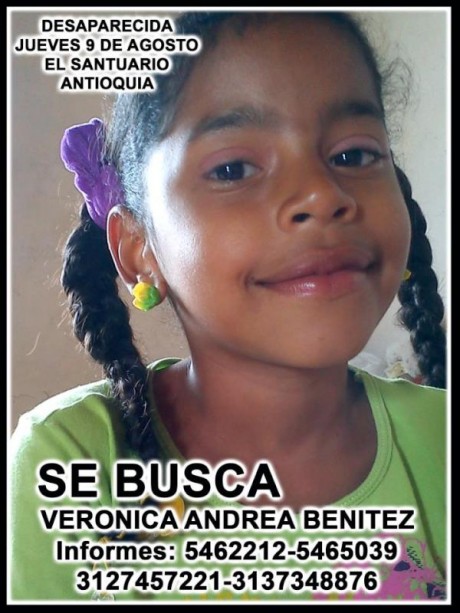 Minuto30.com .- La niña Verónica Andrea Benítez desapareció hoy jueves 9 de Agosto en El Santuario, municipio del oriente antioqueño.