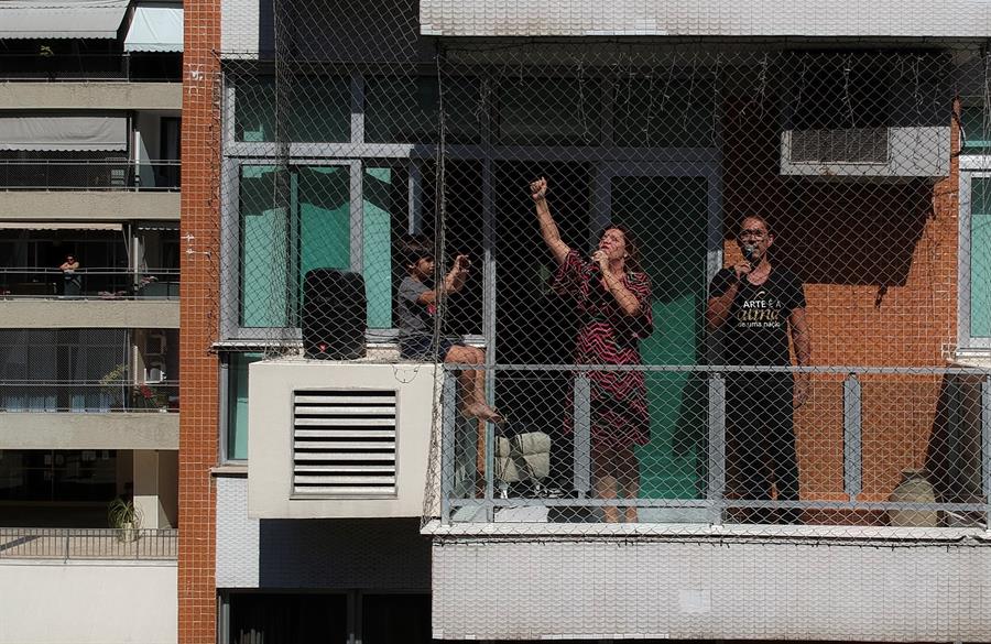 Una pareja de cantantes de ópera del Teatro Municipal de Río de Janeiro convirtió el balcón del apartamento en que viven en esta ciudad brasileña en un escenario para cantarle a sus vecinos y darles algunos minutos de alegría en tiempos de confinamiento por la pandemia del coronavirus.