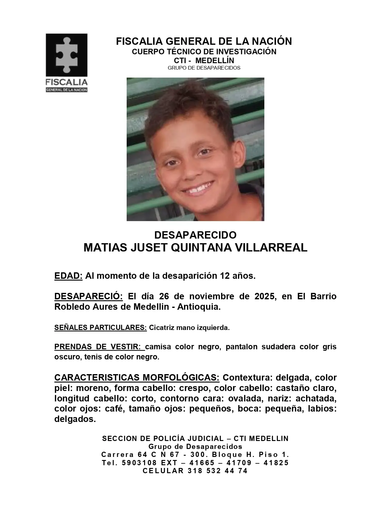 Minuto30.com .- Matías Juset Quintana Villarreal, un menor de 12 años de edad, se encuentra desaparecido desde el pasado 26 de noviembre de 2025 en el barrio Robledo Aures de Medellín, Antioquia. La Fiscalía General de la Nación solicita ayuda urgente para su localización.