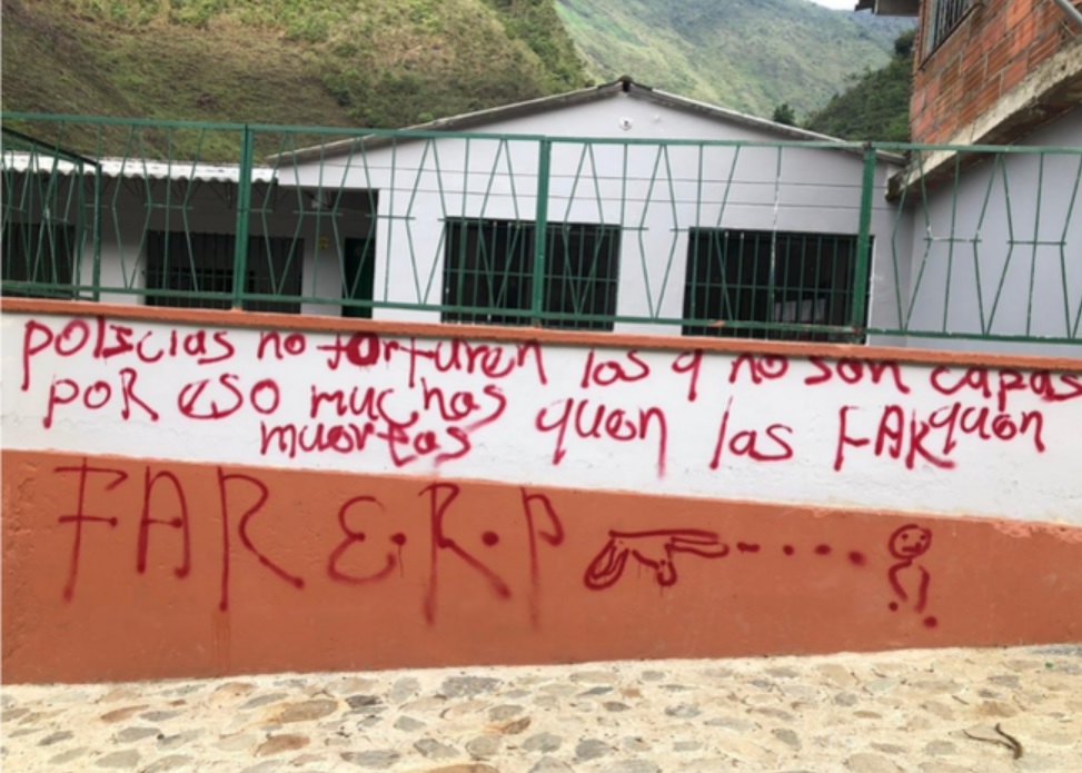 Tal y como informó la comunidad de la vereda Santa Lucía, personas desconocidas pintaron mensajes alusivos a las desmovilizadas Fuerzas Armadas Revolucionarias de Colombia, Farc.
