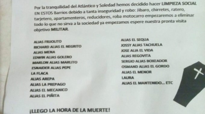 En la misiva escribieron: “por tranquilidad de Atlántico y Soledad hemos decidido hacer limpieza social en estos barrios debido a tanta inseguridad y robo (…) espere nuestra pronta visita, objetivo militar”. Según la firma, la estructura criminal que estaría tras esto es el Bloque Central Renacer-BCR-, y estaría buscando acabar con la vida de varias personas, que según el escrito, son “jíbaros, chirretes, rateros, tarjeteros, apartamenteros, reducidores, y ladrones de motocarros”.