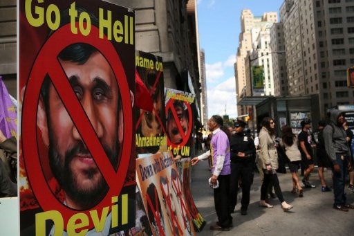 ©AFP/GETTY IMAGES / spencer platt | Manifestantes expresan su rechazo por la presencia en Nueva York del presidente iraní Mahmud Ahmadinejad