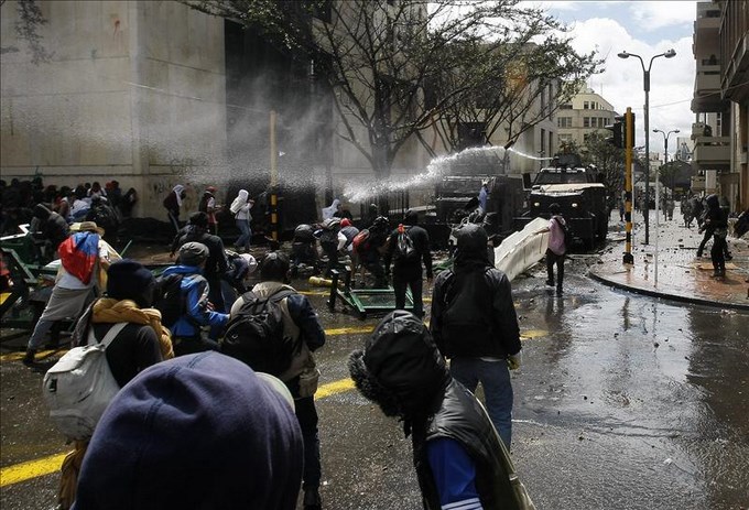 Manifestantes se enfrentan a la policía durante una protesta en apoyo a la huelga campesina en Colombia. EFE