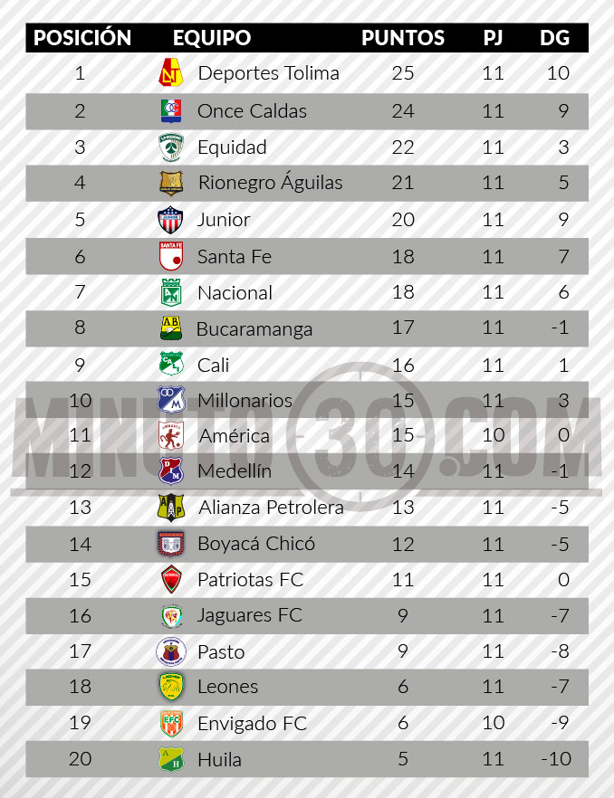 Entre tanto, Atlético Nacional se quedó en 18 puntos y cayó a la séptima plaza, mientras que Independiente Medellín se mantuvo en el puesto 12, con 14 unidades.