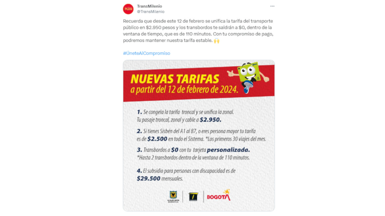 “Esta decisión de congelar la tarifa para el troncal se toma pensada en el bolsillo de los usuarios. Es importante tener cuenta que el valor del pasaje que paga el usuario es inferior al costo que se tiene para transportarlo. La ciudad subsidia el valor restante para beneficiar a la ciudadanía”, indicó la secretaria de Movilidad, Claudia Díaz.