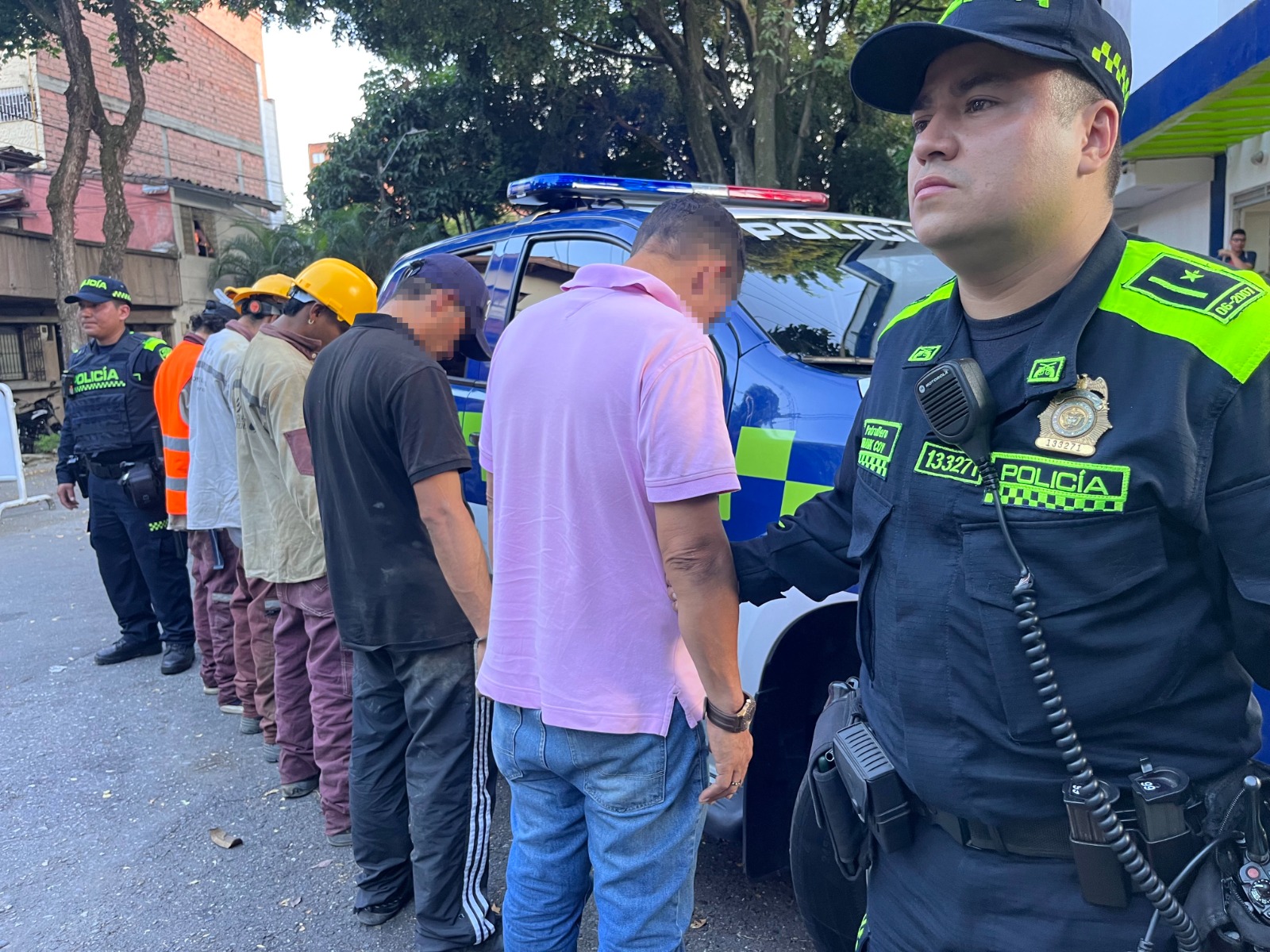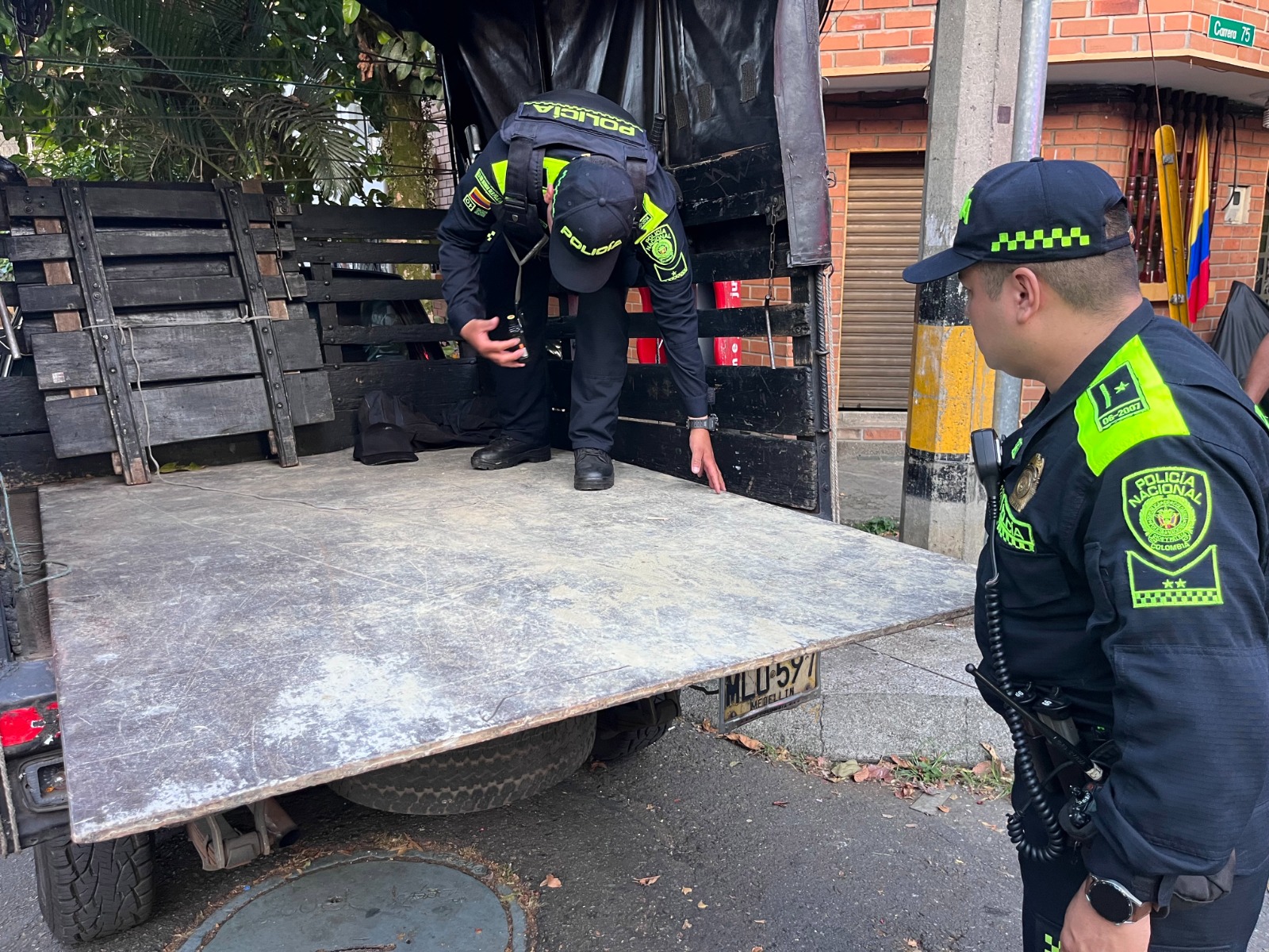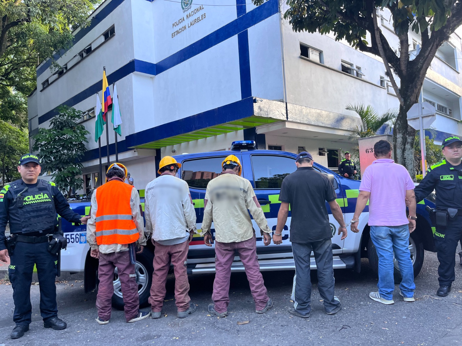 Cuando llega el cuadrante al lugar, observa a cinco hombres, tres de ellos con uniformes de EPM. El conductor del vehículo le informa a los policías que fueron contratados para trasladar dicha placa a otra obra.