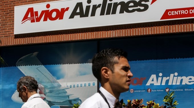 Personas caminan frente a una oficina de la aerolínea venezolana Avior Airlines