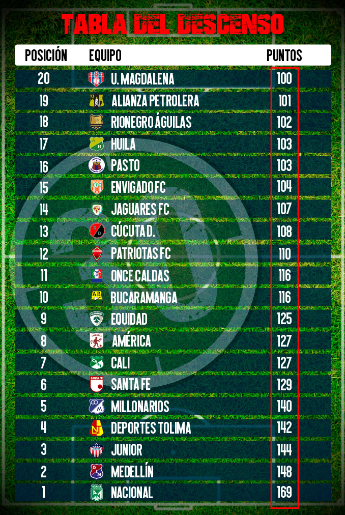Por su parte, Rionegro Águilas Doradas, que tiene 102; Atlético Huila y Deportivo Pasto, con 103 cada y uno; y Envigado FC, con 104; urgen sumar, pues un pequeño resbalón podría llevarlo a la zona de descenso.