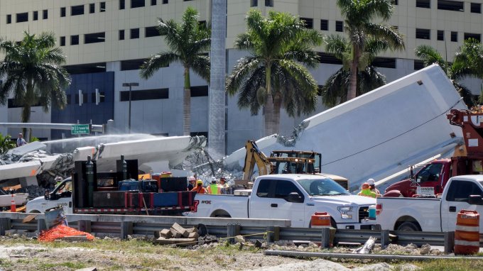 El puente peatonal de 950 toneladas de peso y 174 pies de largo (53 metros) estaba aún en construcción cuando se vino abajo el pasado jueves y sepultó a ocho automóviles.
