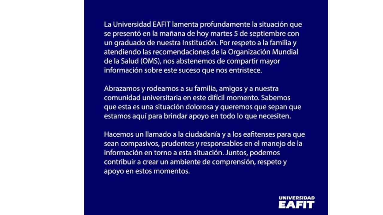“La Universidad EAFIT lamenta profundamente la situación (…) Atendiendo a las recomendaciones de la Organización Mundial de la Salud (OMS), nos abstenemos de compartir mayor información sobre este suceso que nos entristece”, dice el inició del comunicado.