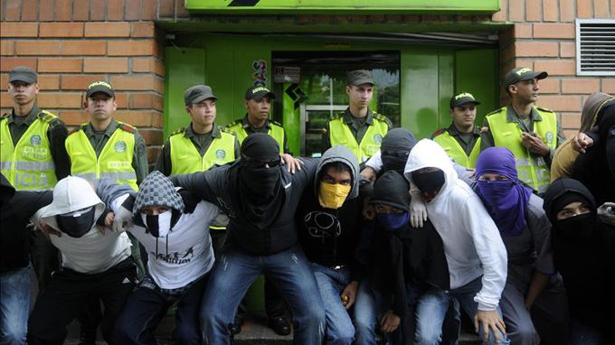 Un grupo de encapuchados con distintivos de las FARC en el campus de la Universidad Nacional. EFE