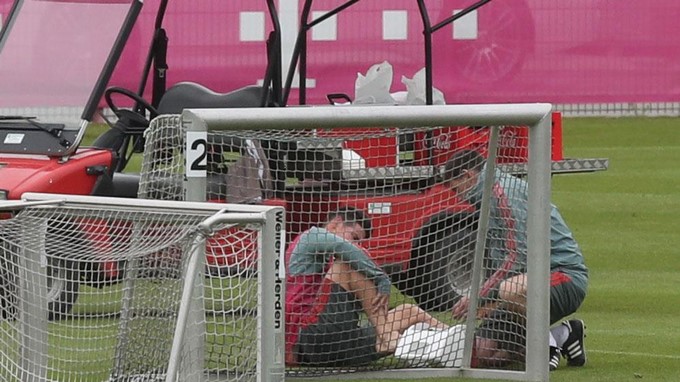 El colombiano quedó tendido por varios minutos en el césped hasta que finalmente abandonó la sesión tras un aparente dolor en el tobillo.