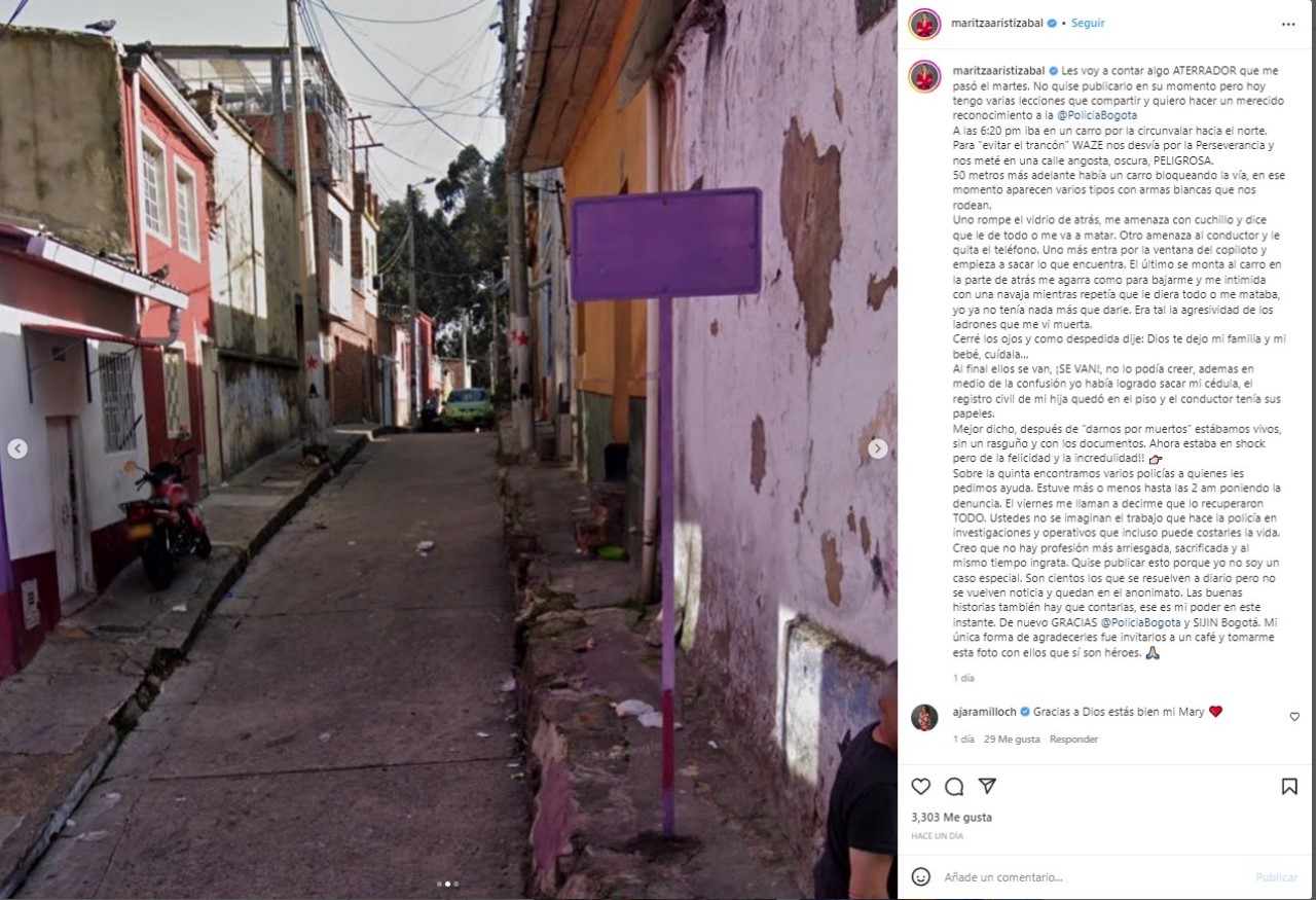 50 metros más adelante había un carro bloqueando la vía, en ese momento aparecen varios tipos con armas blancas que nos rodean”, contó en su ultima publicación.