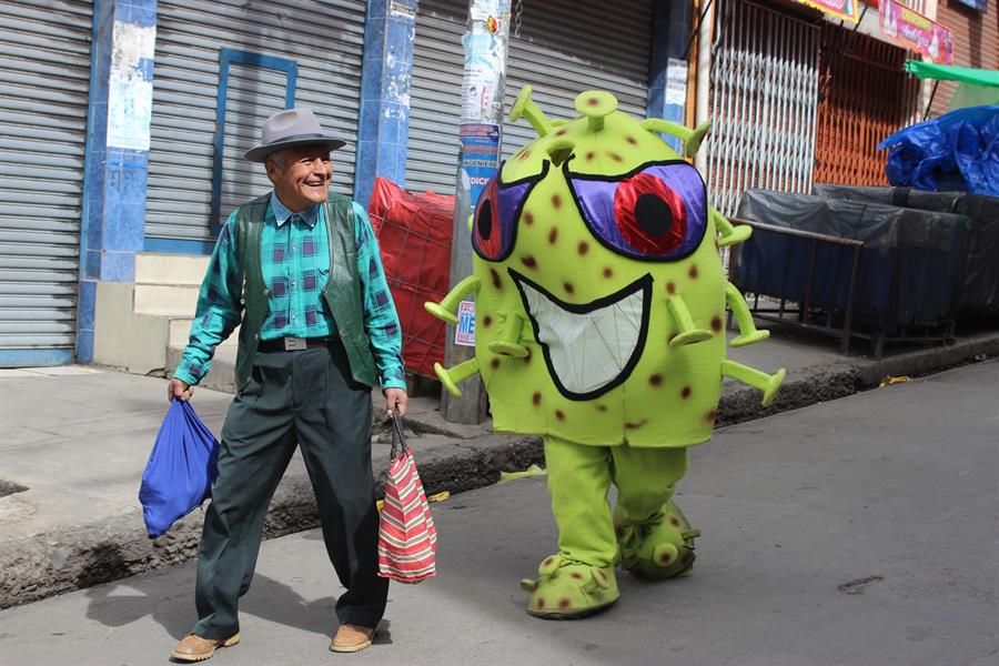 “Hola, hola amigo, soy el coronavirus”, anuncian animados estos virus de tamaño humano al acercarse a los transeúntes en lugares que mantienen una alta concurrencia, como los mercados callejeros de La Paz, a pesar de las restricciones dispuestas por el Gobierno interino de Bolivia.