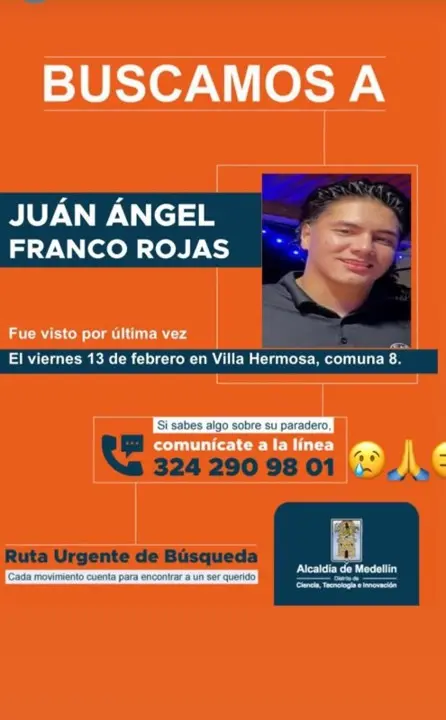 Minuto30.com .- La angustia crece para la familia y amigos de Juan Ángel Franco Rojas, de quien se perdió todo rastro desde el pasado viernes 13 de febrero. Según el reporte de sus allegados, el joven fue visto por última vez a las 5:00 de la tarde en el barrio Villa Hermosa, en el oriente de Medellín, cuando abordó un taxi con un destino al que nunca llegó.