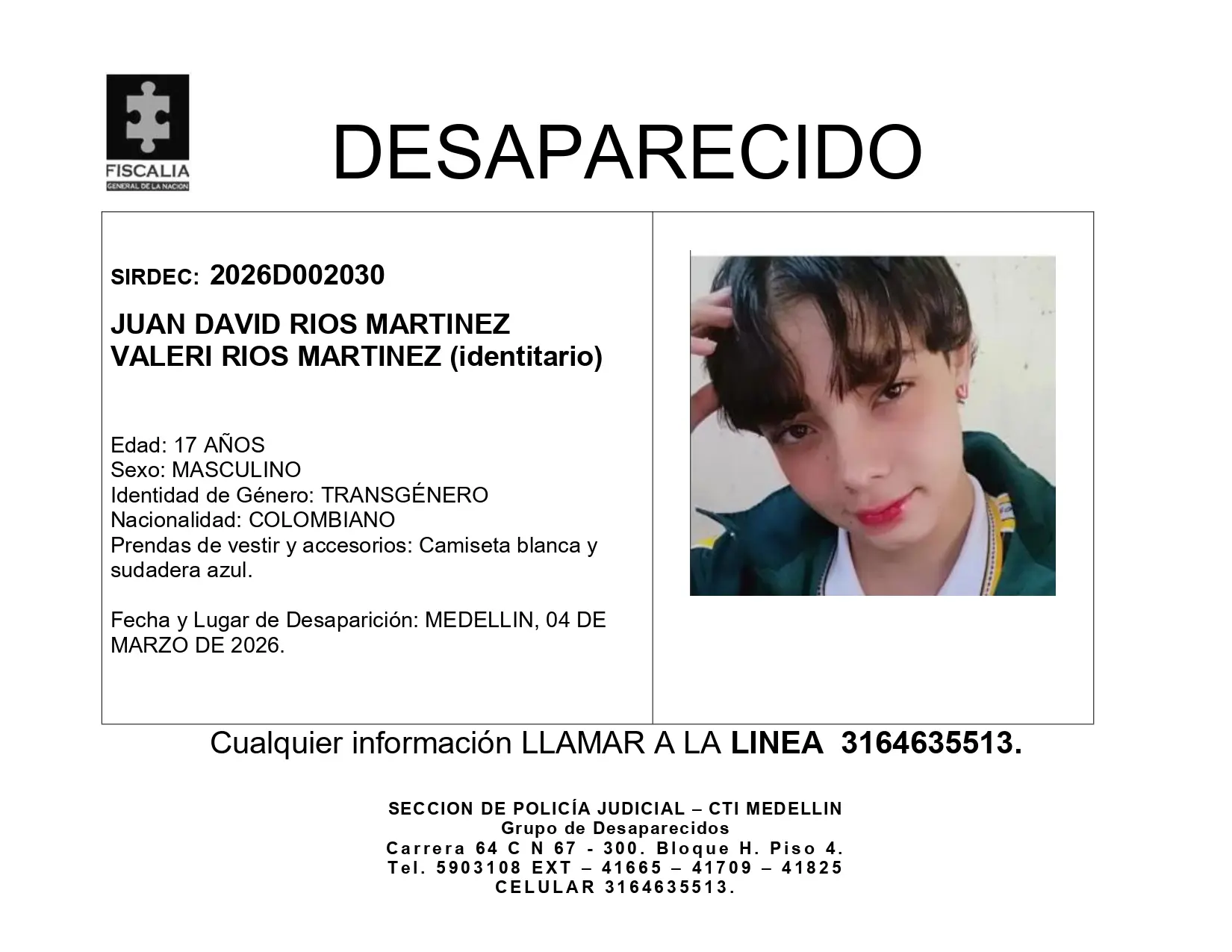 Minuto30.com .- La angustia crece en la capital antioqueña. Ya han pasado más de tres semanas desde que se perdió el rastro de Valeri Ríos Martínez (nombre identitario), una joven de 17 años que fue vista por última vez en la ciudad de Medellín el pasado 4 de marzo de 2026.