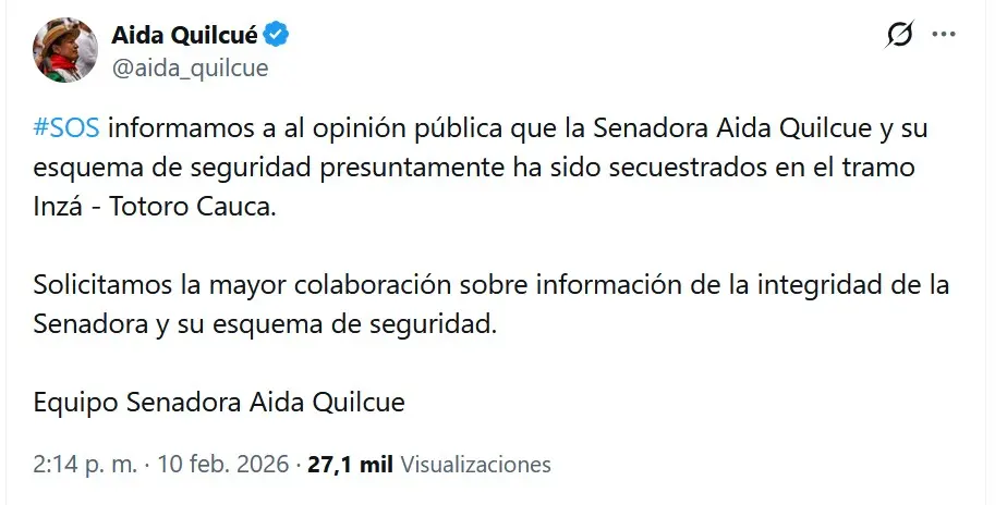 “Informamos a la opinión pública que la Senadora Aida Quilcue y su esquema de seguridad presuntamente han sido secuestrados… Solicitamos la mayor colaboración sobre información de la integridad de la Senadora”, reza el comunicado publicado hace menos de una hora.