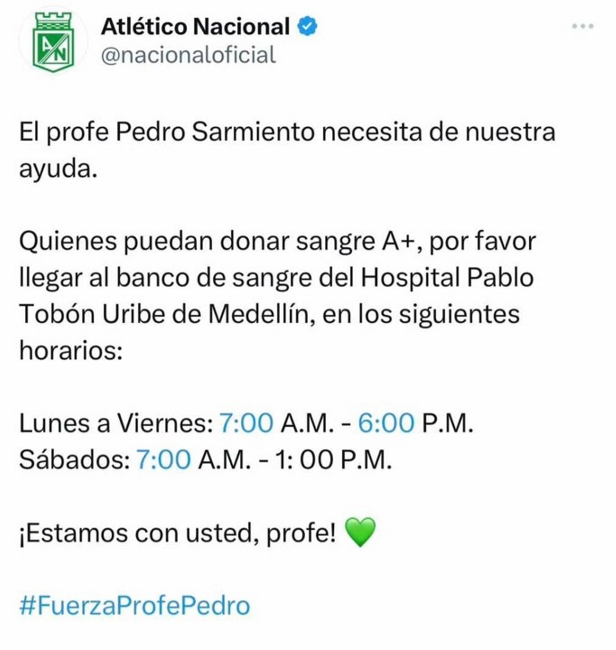 Atlético Nacional y varios clubes así lo informan a través las redes sociales: piden sangre A+.