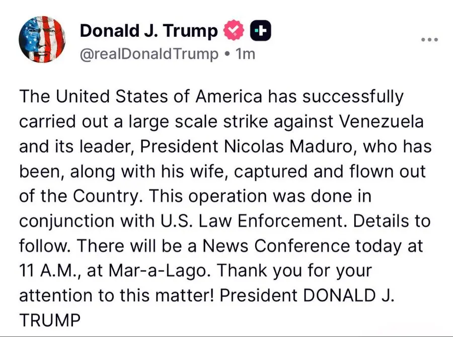 “Estados Unidos ha llevado a cabo con éxito un ataque a gran escala contra Venezuela y su líder, el presidente Nicolás Maduro, quien ha sido capturado y trasladado fuera del país junto con su esposa. Esta operación se realizó en conjunto con las fuerzas del orden de EE. UU. Se darán más detalles próximamente. Hoy habrá una conferencia de prensa a las 11 a. m. en Mar-a-Lago. ¡Gracias por su atención a este asunto! Presidente DONALD J. TRUMP”