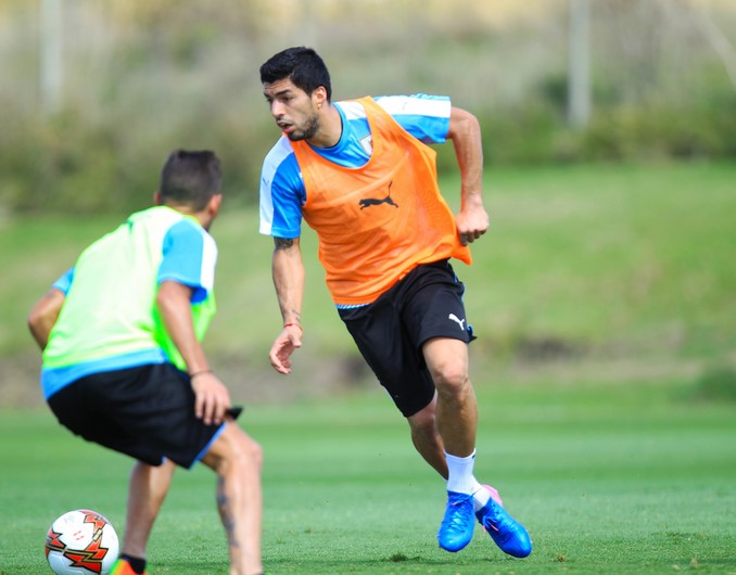 El delantero del Barcelona Luis Suárez, que no pudo estar presente en el encuentro contra Brasil por acumulación de tarjetas, se entrenó a la par de sus compañeros y participó activamente en los ejercicios y en el partido que disputaron los suplentes para ponerse a punto y jugar contra Perú.