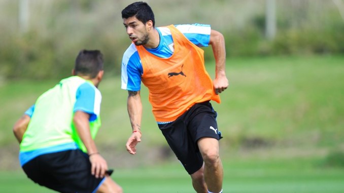 El delantero del Barcelona Luis Suárez, que no pudo estar presente en el encuentro contra Brasil por acumulación de tarjetas, se entrenó a la par de sus compañeros y participó activamente en los ejercicios y en el partido que disputaron los suplentes para ponerse a punto y jugar contra Perú.