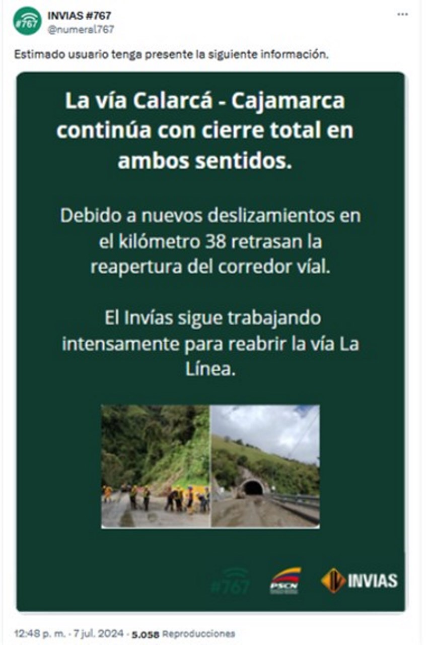 Minuto30.com .- La tarde de este domingo 7 de julio, Invías informa que se mantiene el cierre total de la vía Calarcá – Cajamarca debido a nuevos derrumbes.