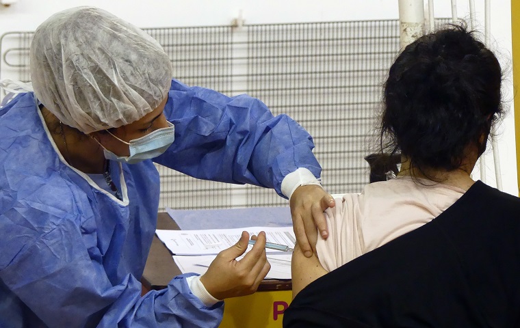 Trabajadores de la salud independientes son vacunados el 3 de febrero de 2021 contra la covid-19, en el Estadio Monumental de Núñez, en Buenos Aires (Argentina). EFE/ Enrique García Medina