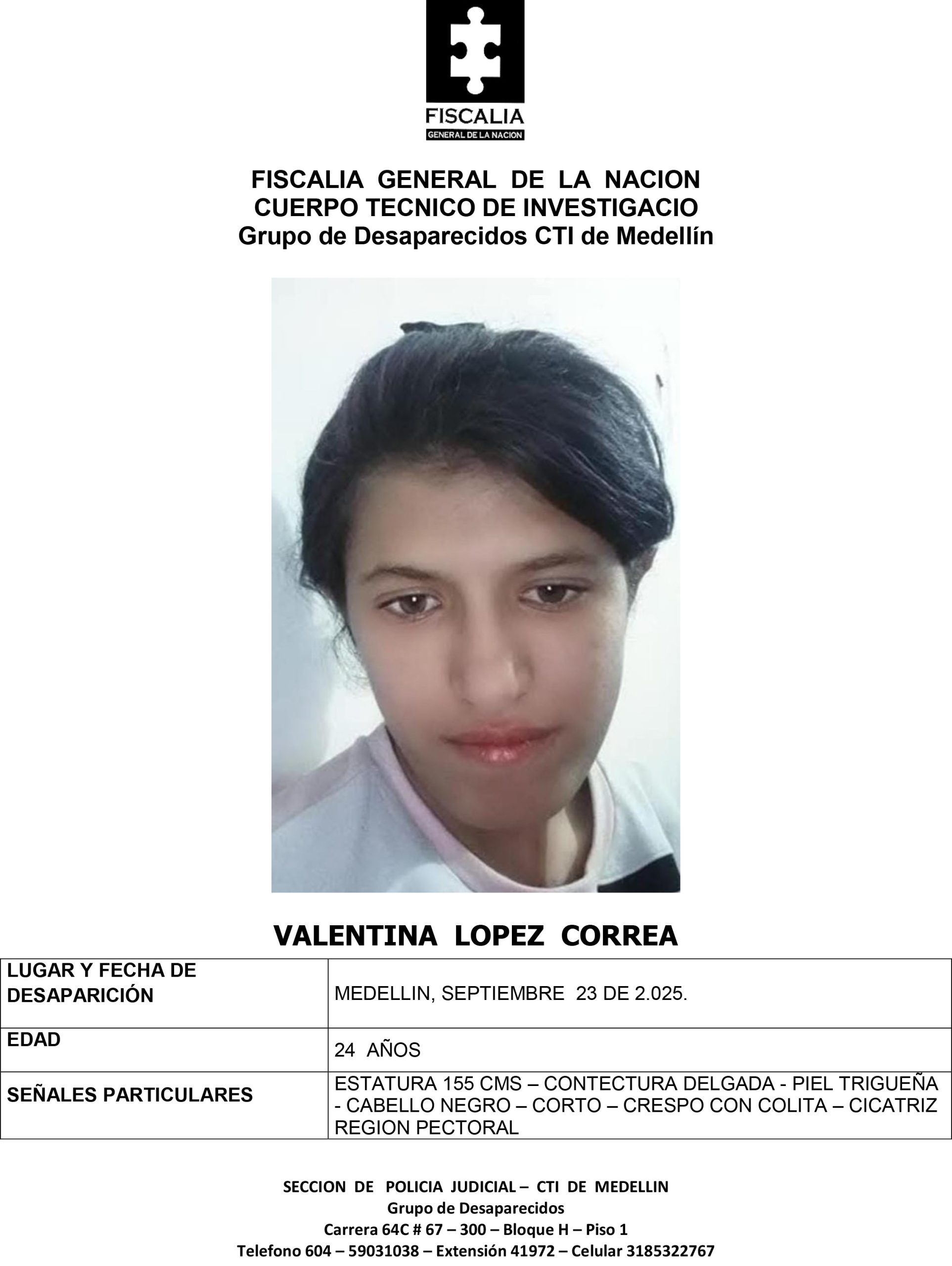 Valentina López Correa desapareció en Medellín el 23 de septiembre de 2025. Al momento de su desaparición, tenía 24 años.