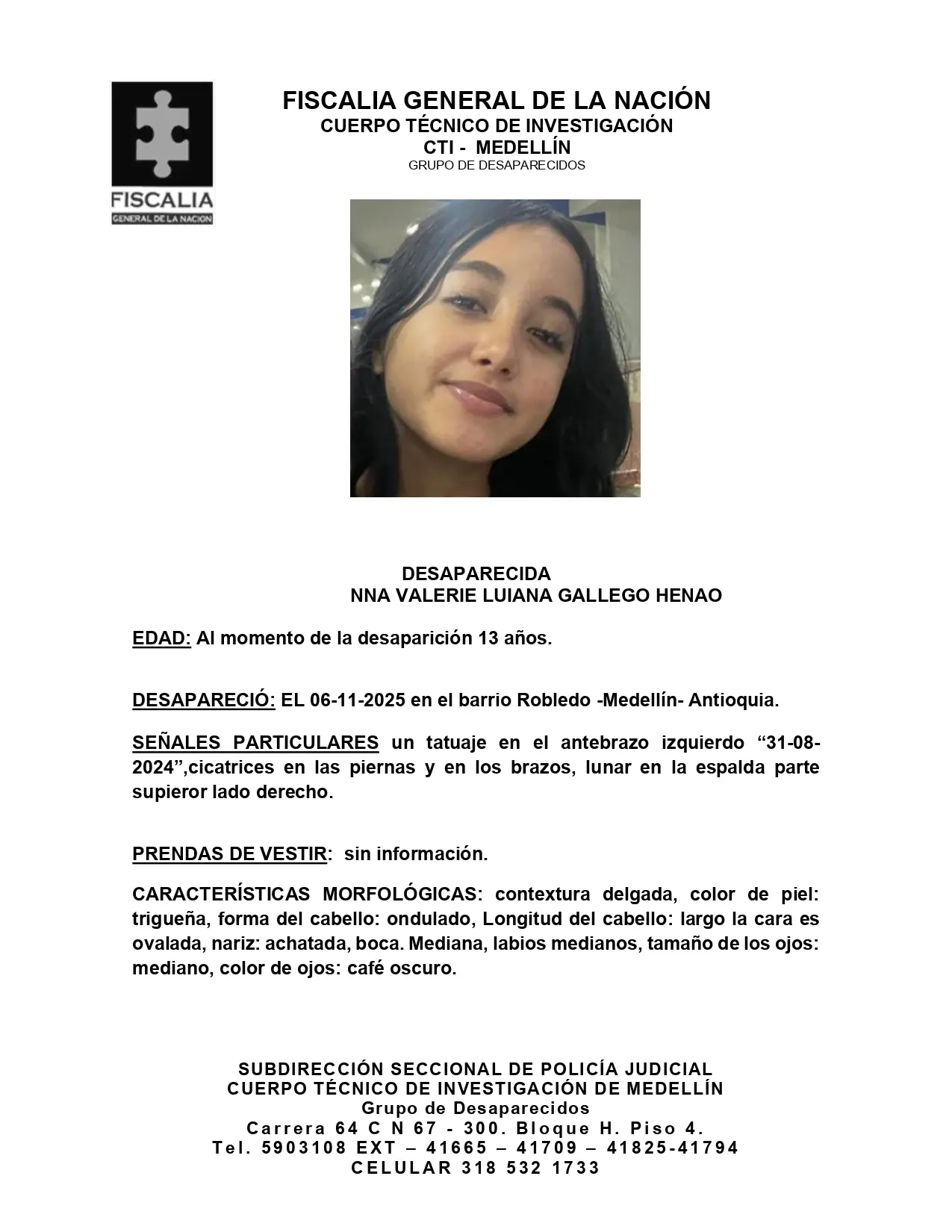 Minuto30.com .- Una alerta de búsqueda ha sido emitida en Medellín para encontrar a Valerie Luiana Gallego Henao, una adolescente de 13 años de edad, cuyo rastro se perdió el pasado 6 de noviembre de 2025 en el barrio Robledo.