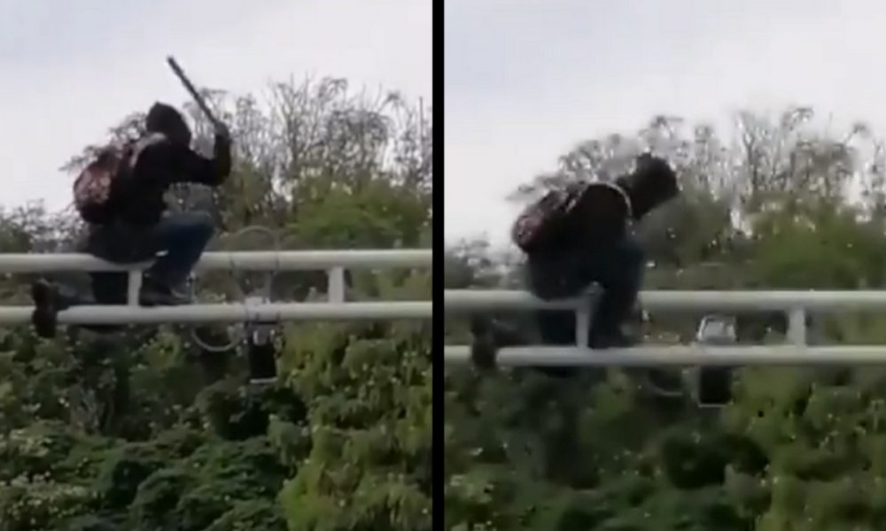 En video quedó registrado el momento en el que un ciudadano se trepa hasta el lugar donde está instalada la cámara LPR y tras un fallido intento por desinstalarla, le dio golpes con un palo.
