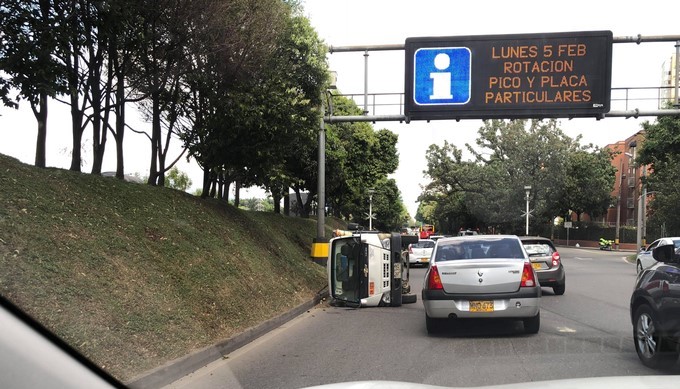Un vehículo pequeño de transporte pesado se volcó este mediodía en la avenida Regional a la altura de la estación Aguacatala del Metro.