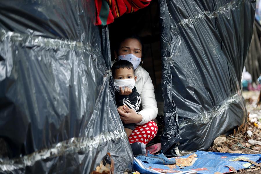 El campamento, en el que hay niños, mujeres embarazadas y ancianos, está ubicado en un separador de la Autopista Norte de Bogotá, cerca a una canal de aguas lluvias que utilizan para bañarse y lavar la poco ropa que llevan en maletas y bultos.