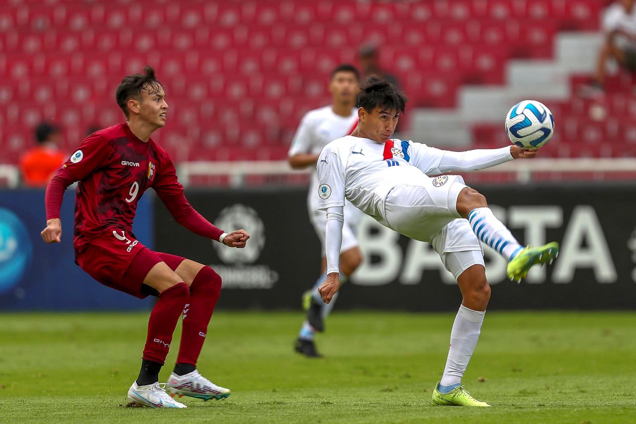 Lucciano Reinoso (d) de Venezuela disputa el balón con Angel Aguayo (i) de Paraguay hoy, durante un partido del Campeonato Sudamericano sub-17 entre las selecciones de Venezuela y Paraguay en el estadio Rodrigo Paz en Quito (Ecuador). EFE/José JácomeLa tarde la redondeó González, que firmó uno de los goles del torneo con un derechazo que besó el palo izquierdo de la portería de Paraguay para deleite de los aficionados venezolanos presentes en el estadio Rodrigo Paz Delgado.