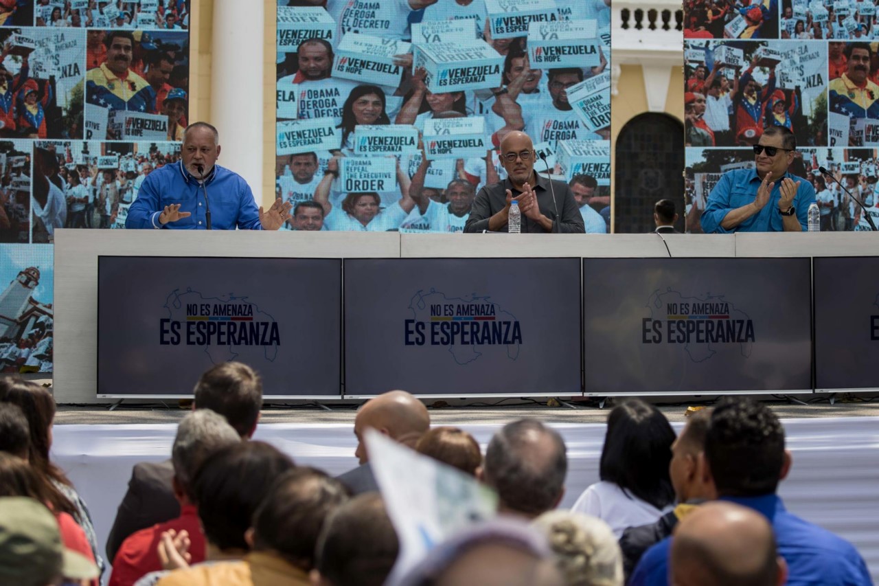 El diputado Diosdado Cabello (i), el presidente de la Asamblea Nacional, Jorge Rodriguez (c) y el expresidente de Ecuador, Rafael Correa (d), participan en un acto por el “Día del Antiimperialismo Bolivariano” hoy, en Caracas (Venezuela). EFE/Miguel Gutierrez