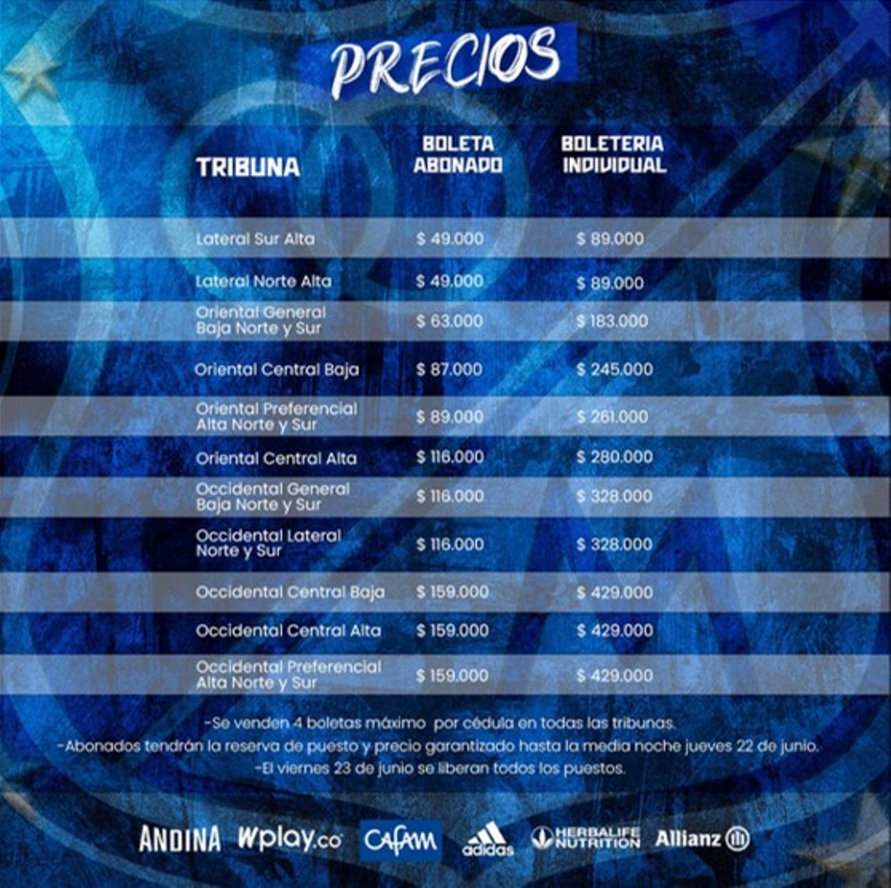 Tenga en cuenta que no se venderá más de 4 boletas a una persona; a los abonados se les respetará la ubicación hasta la noche del 22 de junio, por lo que para el viernes 23 se habilitará la venta general de entradas.