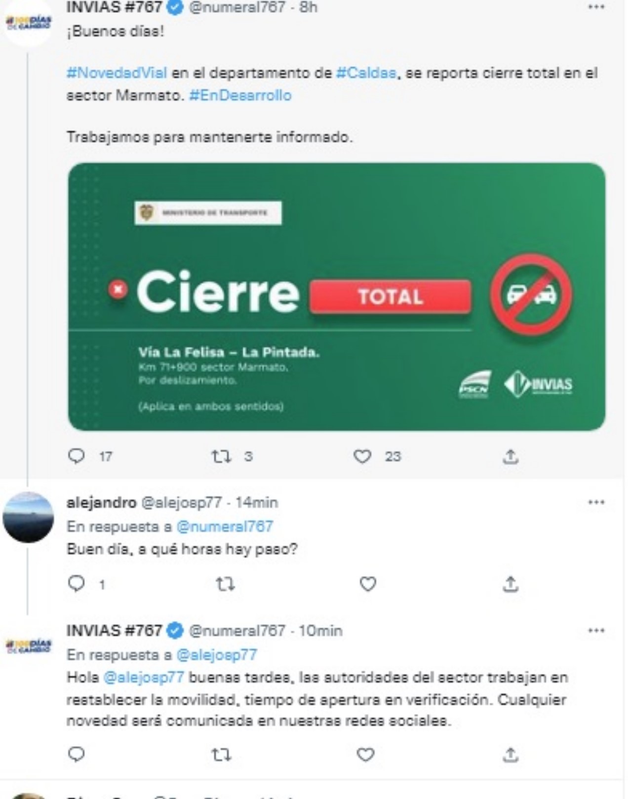 El Programa de Seguridad en Carreteras Nacionales del INVIAS informó por medio de su cuenta de Twitter: “la vía La Felisa – La Pintada continúa con cierre total. Las autoridades del sector trabajan en restablecer la movilidad, disponen como ruta alterna: Pintada – Aguadas – Pácora – San Bartolo – La Felisa, para vehículo liviano”.