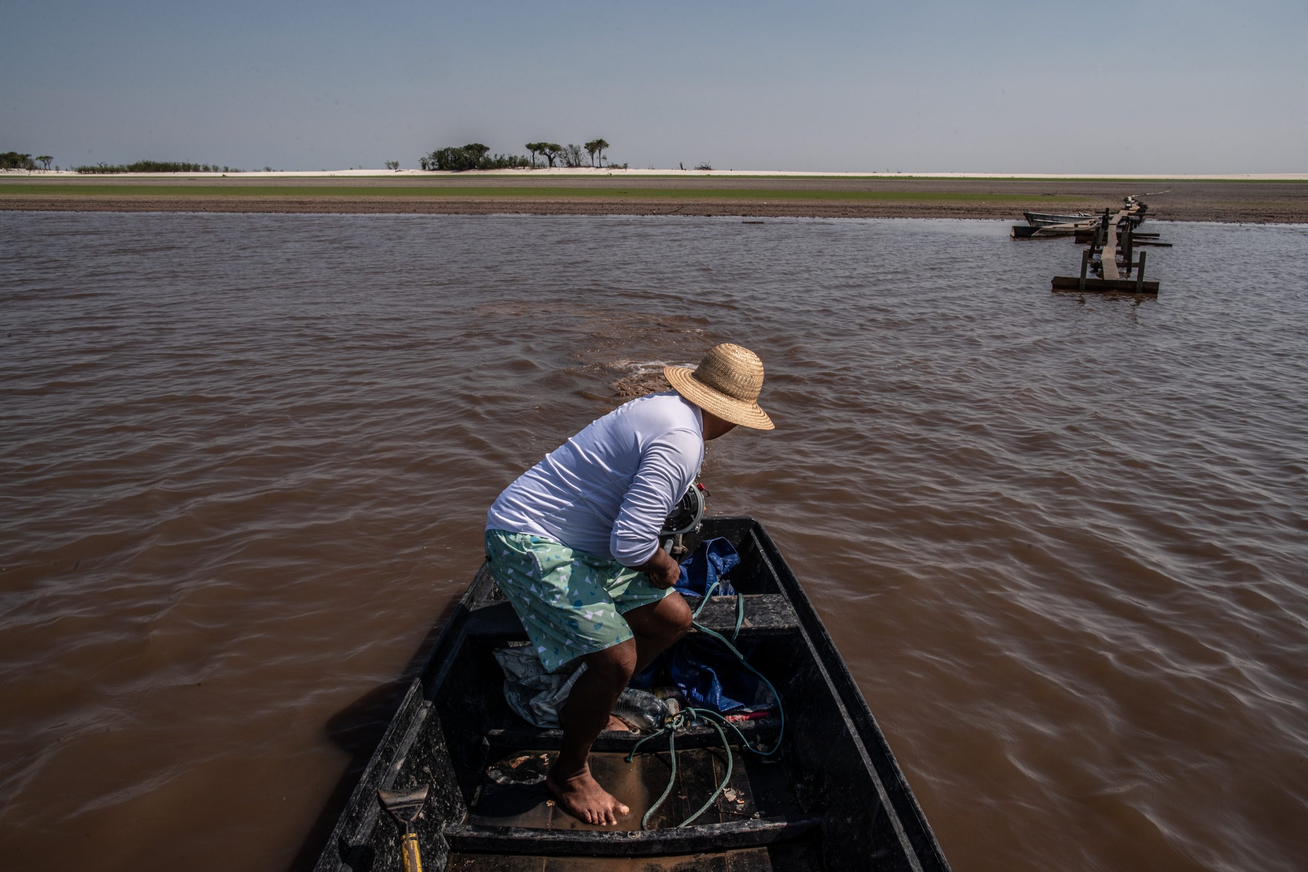 A más de 35 grados, la tierra se cuece a fuego lento como en un taller de alfarería, y Sebastião Brito aparece bajo un sombrero de paja para guiar a los pasajeros de la lancha hasta la orilla.