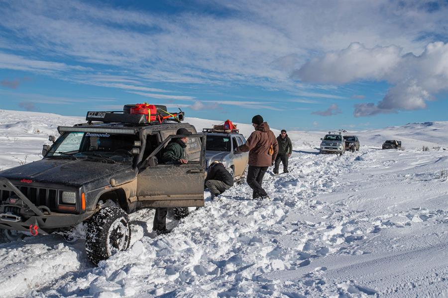 Hasta donde alcanza la vista solo se ve un manto blanco de nieve que oculta el camino. Doce camionetas cargadas de material se paran en fila mientras un grupo de voluntarios a temperaturas bajo cero intentan despejar con palas la senda que están siguiendo.