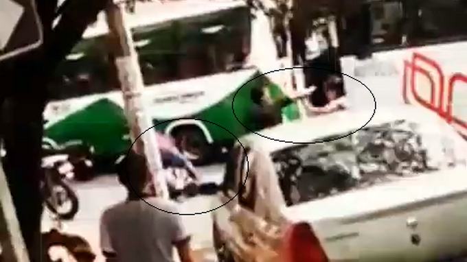 En la grabación se puede observar que dos buses de servicio público están estacionados obstaculizando la vía mientras estos hombres protagonizan una pelea en frente de los transeúntes del sector.