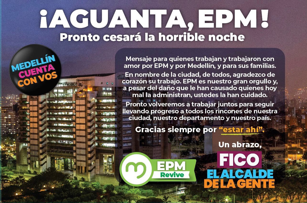 “En nombre de la ciudad, de todos, agradezco de corazón su trabajo. EPM es nuestro gran orgullo y a pesar del daño que le han causado quien hoy mal la administran, ustedes la han cuidado”, decía el volante que estuvo entregando en los alrededores del edificio.
